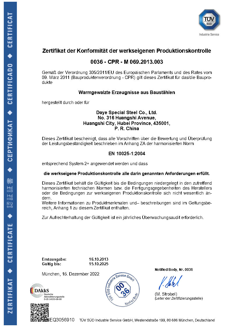 大(dà)冶特鋼棒材、鍛材、無縫鋼管CPR證書(shū)
