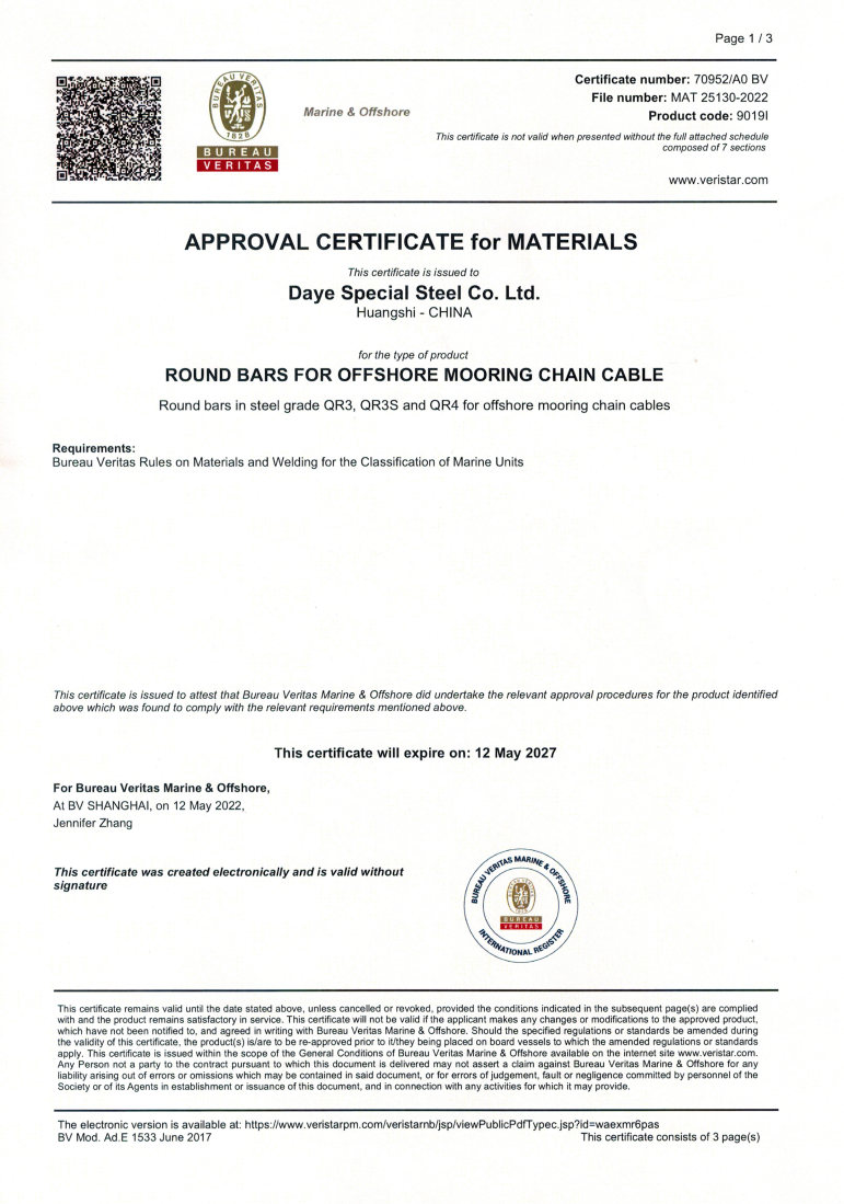 法國(guó)船(chuán)級社(BV)系泊鏈轉爐産線工(gōng)廠(chǎng)認可(kě)證書(shū)