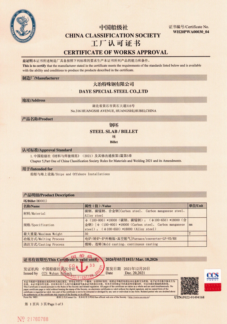 中國(guó)船(chuán)級社(CCS)鋼坯、軋制(zhì)圓鋼工(gōng)廠(chǎng)認可(kě)證書(shū)