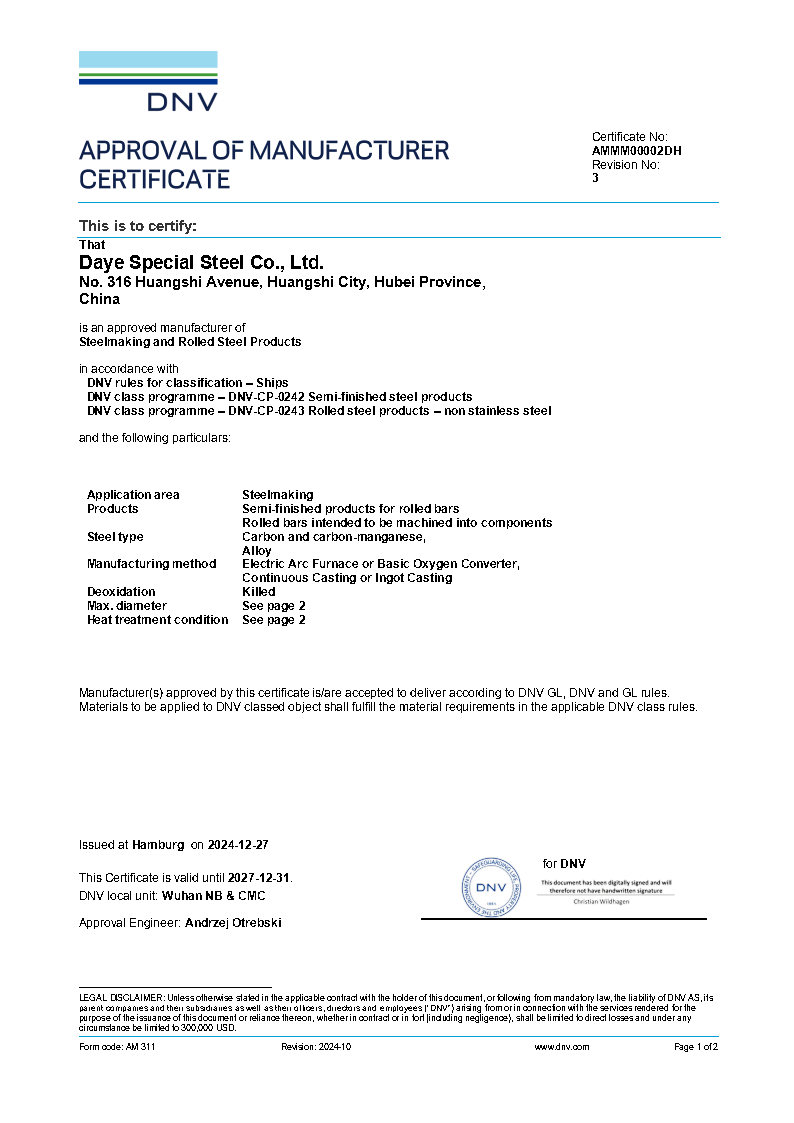 挪威船(chuán)級社(DNV)軋制(zhì)圓鋼工(gōng)廠(chǎng)認可(kě)證書(shū)