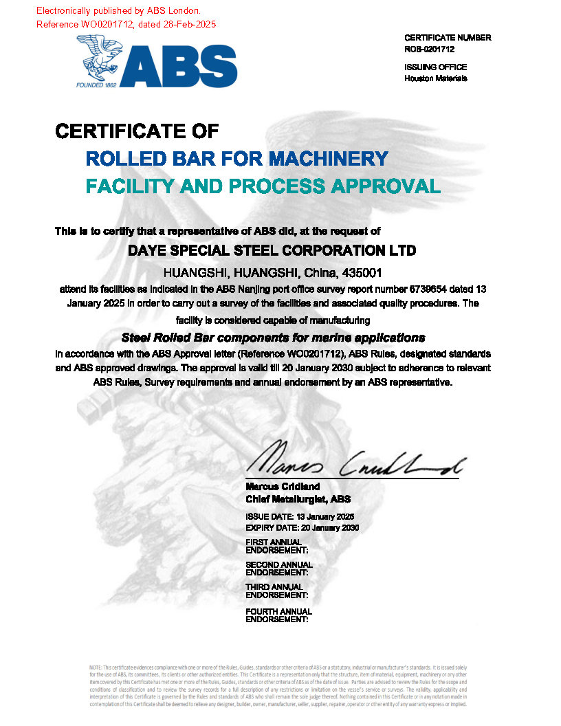 美(měi)國(guó)船(chuán)級社(ABS)軋材工(gōng)廠(chǎng)認可(kě)證書(shū)