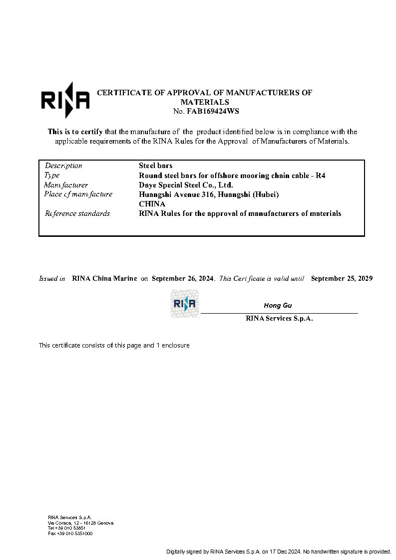 意大(dà)利船(chuán)級社(RINA)系泊鏈認可(kě)證書(shū)