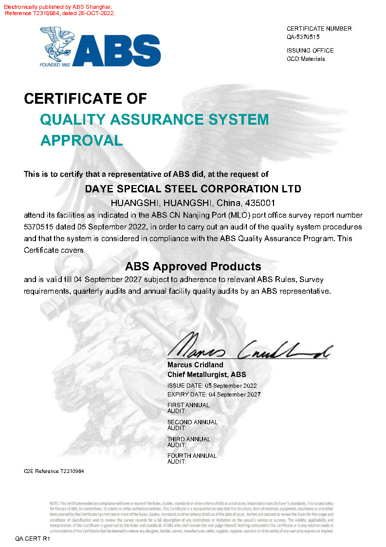 美(měi)國(guó)船(chuán)級社ABS錨鏈鋼工(gōng)廠(chǎng)認可(kě)證書(shū)