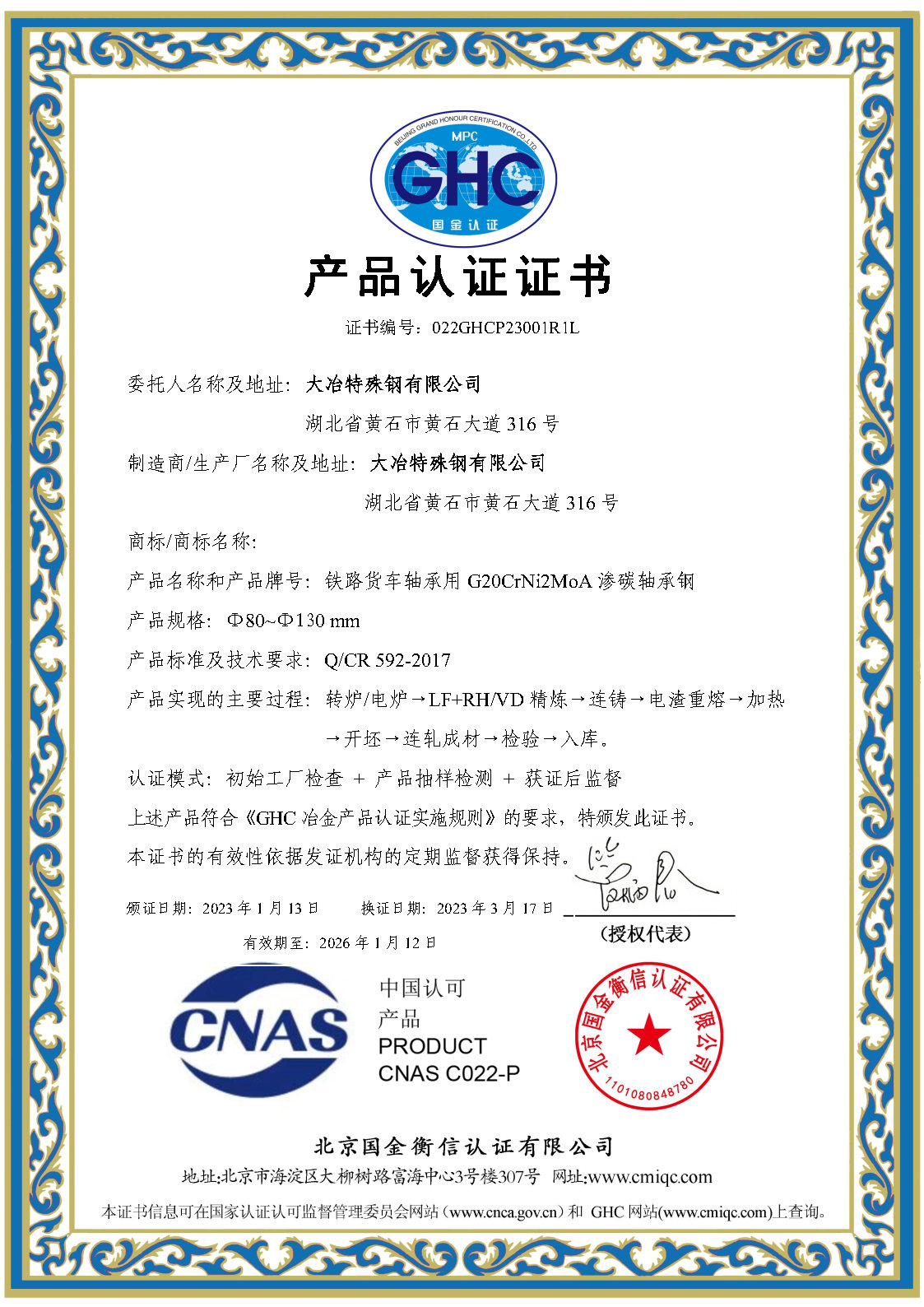 鐵(tiě)路(lù)客車(chē)軸承用(yòng) GCr18Mo 高(gāo)碳鉻軸承鋼産品認證證書(shū)
