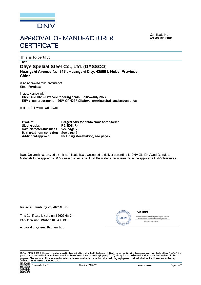 挪威船(chuán)級社(NDV)系泊鏈附件(jiàn)用(yòng)鍛制(zhì)圓鋼工(gōng)廠(chǎng♦)認可(kě)證書(shū)