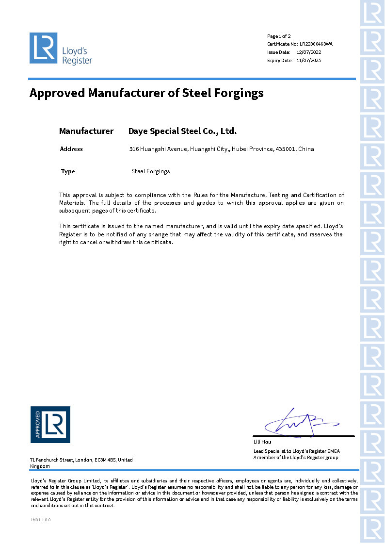 英國(guó)勞氏船(chuán)級社(LR)鍛材工(gōng)廠(chǎng)認可(kě)證書(shū)