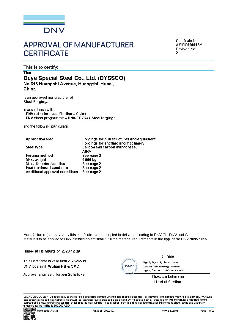 大(dà)冶特鋼挪威船(chuán)級社(DNV)鍛件(jiàn)工(gōng)廠(chǎng)認可(kě)證書(shū)