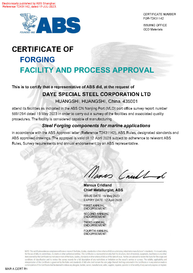 美(měi)國(guó)船(chuán)級社(ABS)鍛件(jiàn)工(gōng)廠(chǎng)認可(kě)證書(s&hū)