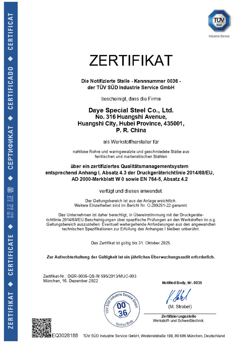 大(dà)冶特鋼棒材、鍛材、無縫鋼管PED證書(shū)