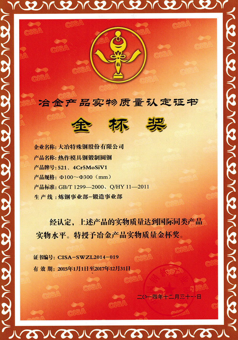 熱(rè)作(zuò)模具鋼鍛制(zhì)圓鋼冶金(jīn)産品實物(wù)質量金(jīn)杯獎
