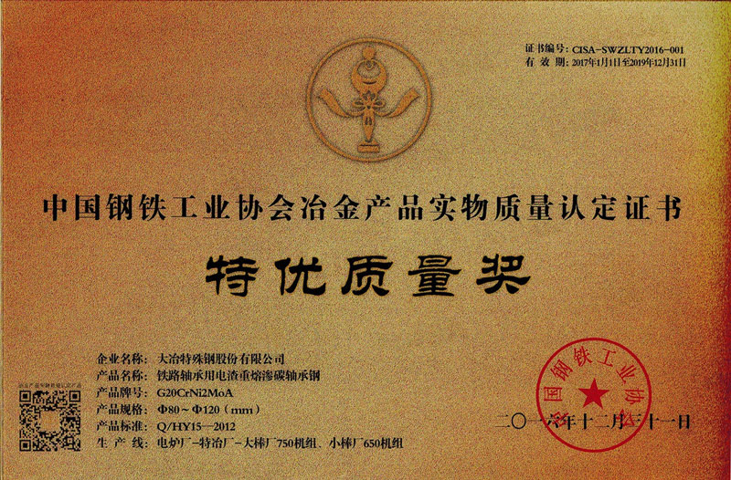 鐵(tiě)路(lù)軸承用(yòng)電(diàn)渣重熔滲碳軸承鋼G20冶金(jīn)産品實物(wù)質量特優質量獎