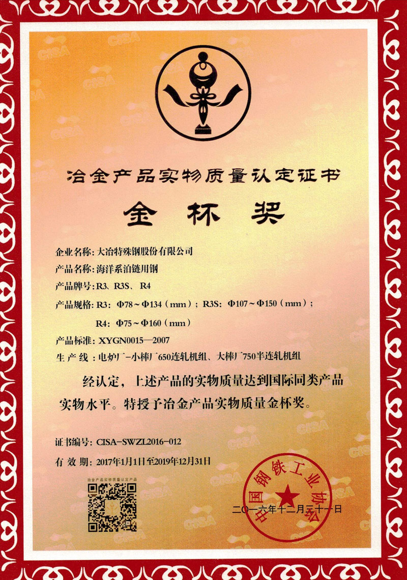 海(hǎi)洋系泊鏈用(yòng)鋼R3、R3S、R4冶金(jīn)産品實物(wù)質量金(jīn)↓杯獎證書(shū)