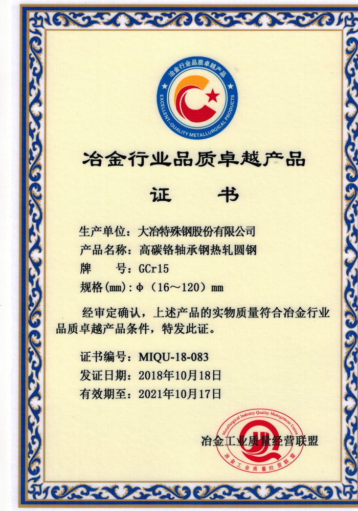 高(gāo)碳鉻軸承鋼熱(rè)軋圓鋼冶金(jīn)行(xíng)業(yè)品質卓越産品證書(shū)
