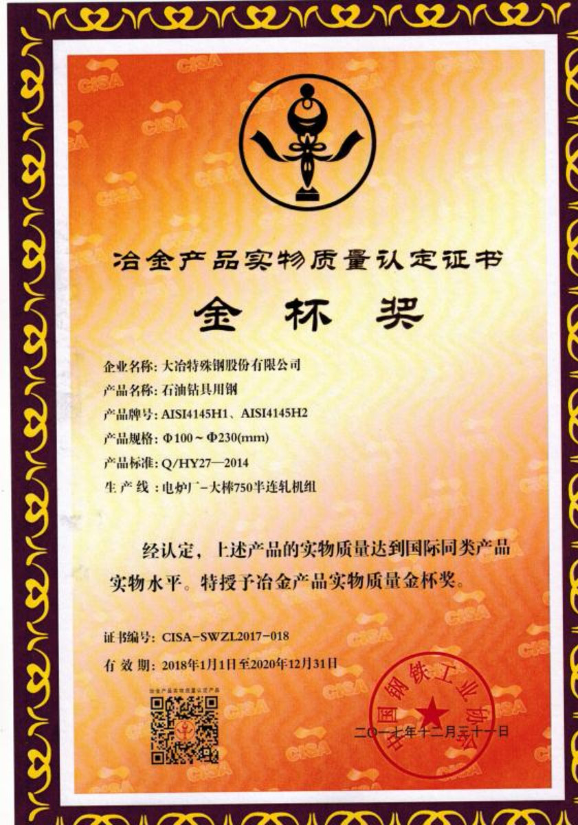 冷(lěng)作(zuò)模具鋼鍛制(zhì)圓鋼冶金(jīn)産品實物(wù)質量金(jīn)杯獎