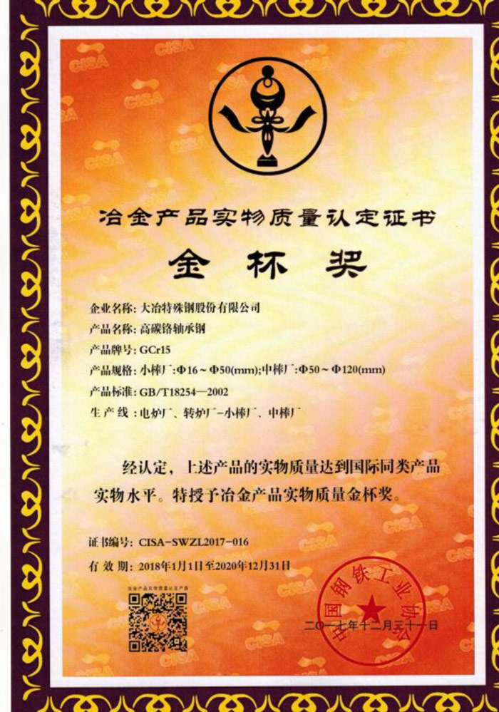 高(gāo)碳鉻軸承鋼GCr15冶金(jīn)産品實物(wù)質量金(jīn)杯獎